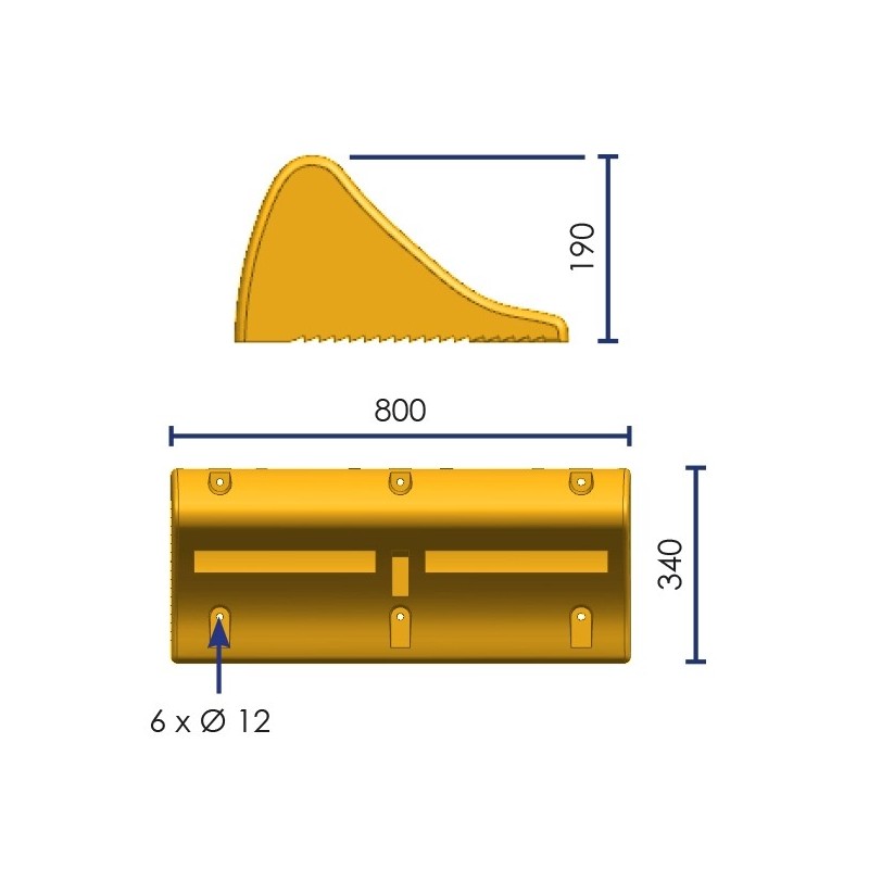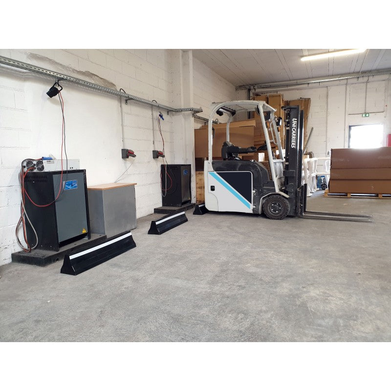 Butée de parking permettant de protéger les infrastructures et les chariots élévateurs.Deux bandes réfléchissantes.Facilement franchissable par les piétons.Fixations en option.