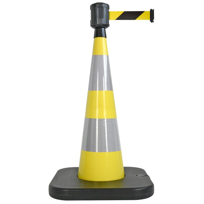 Cône de chantier à sangle permettant de sécuriser un chantier et une zone dangereuse. Le cône possède un socle lesté en caoutchouc et une sangle. La base vide peut être lestée avec de l'eau ou du sable. La sangle quant à elle, possède un système de freinage et anti panique qui permet de décrocher automatiquement la sangle en cas d'urgence.