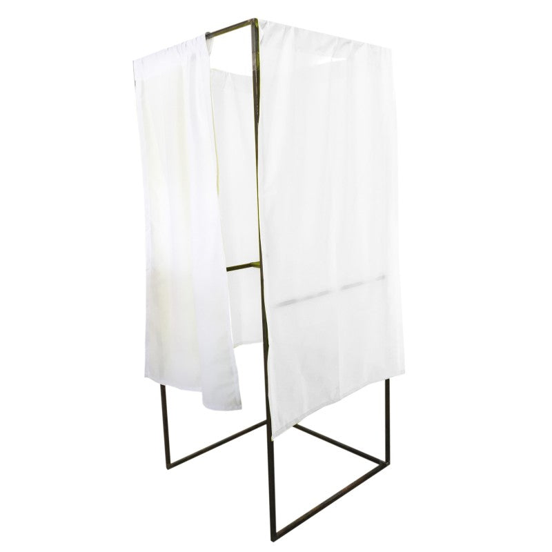 Isoloir normé pour personne à mobilité réduite. Structure démontable en tube carré de 20 x 20 mm, stabilité assurée par croisillons. Patins de protection du sol. Tablette amovible (dimensions 300 mm). Rideau polyester ignifugé 1,60 m sur les 4 côtés. Liaisons pour relier les cellules entre elles. Sac de stockage et de transport en option (ISOBAG).