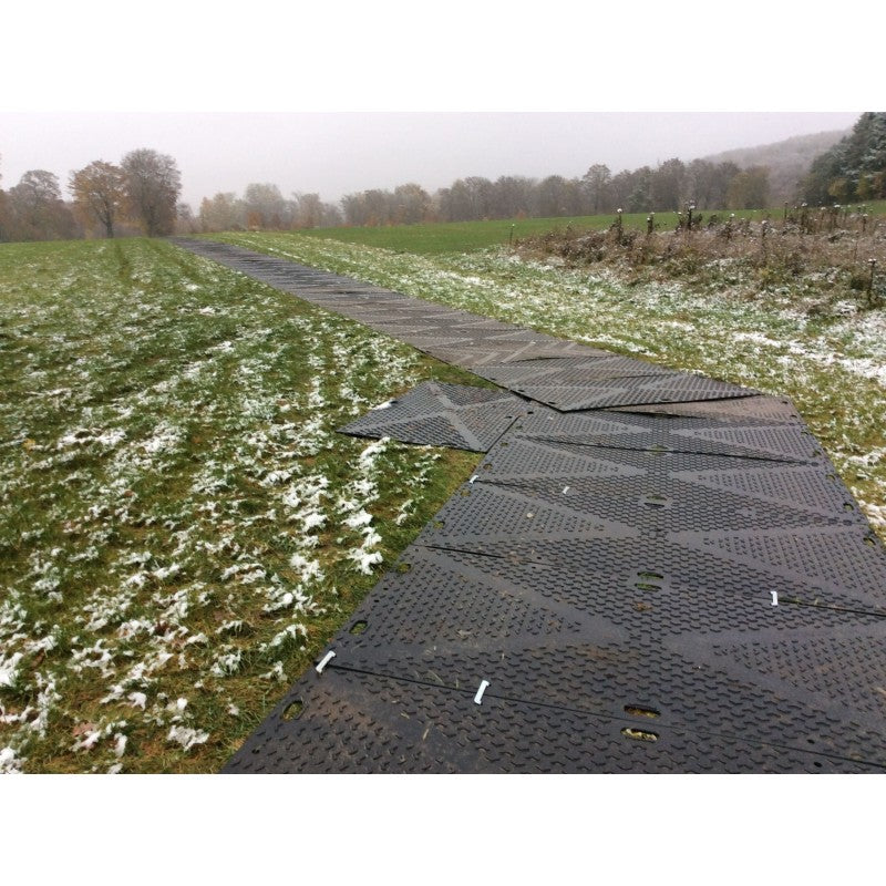 Plaque de roulage temporaire conçue pour protéger le sol contre les dommages qui peuvent être causés par les travaux de chantier et de maintenance, tout en assurant un passage fluide et stable des véhicules lourds.