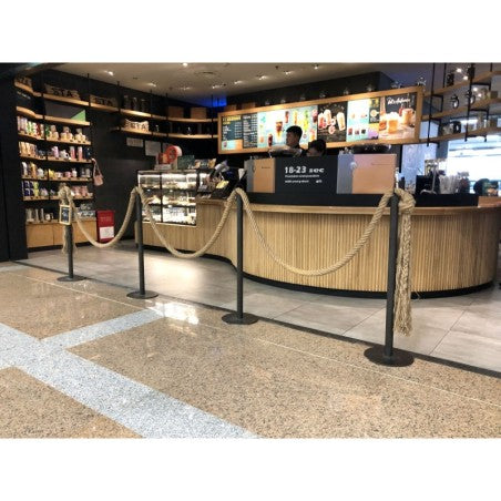 Poteau de guidage pour corde filante en acier noir permettant de délimiter un accès facilement de manière temporaire ou permanente. Base lestée. Fabriqué en acier. Possède également un anneau à trous pour accrocher des chaînes dans 4 directions possibles. Disponible en plusieurs couleurs. Les panneaux d'information et accessoires sont livrés séparément.