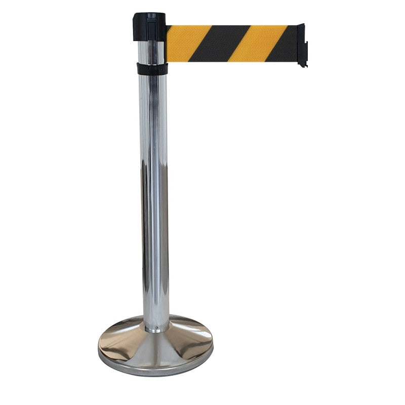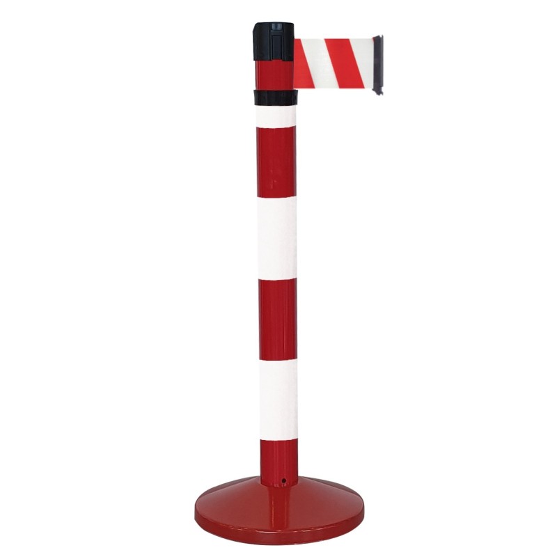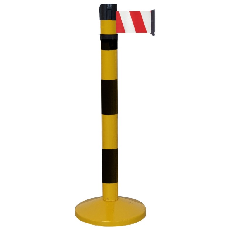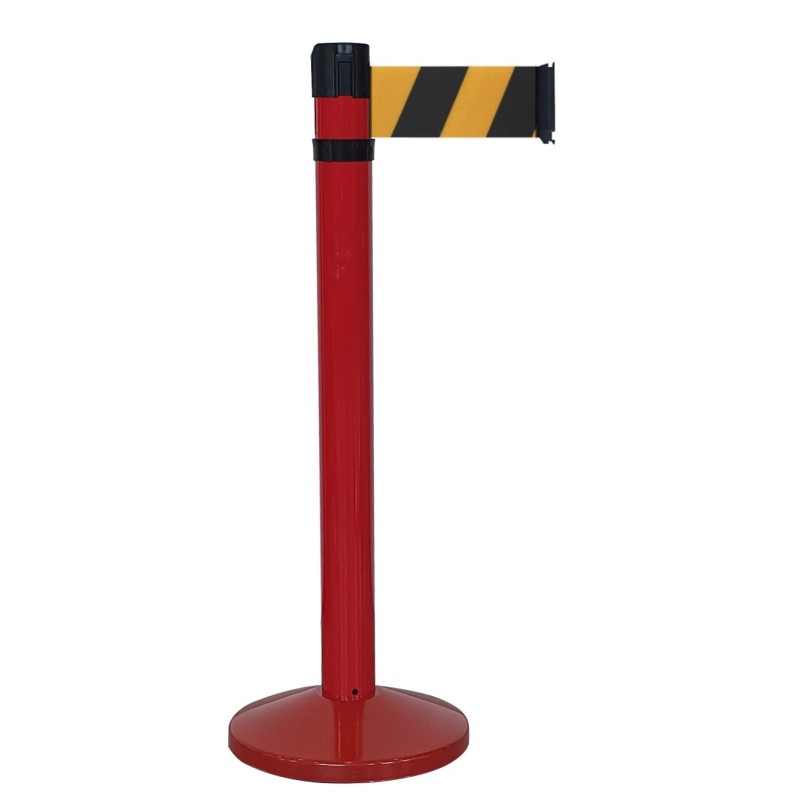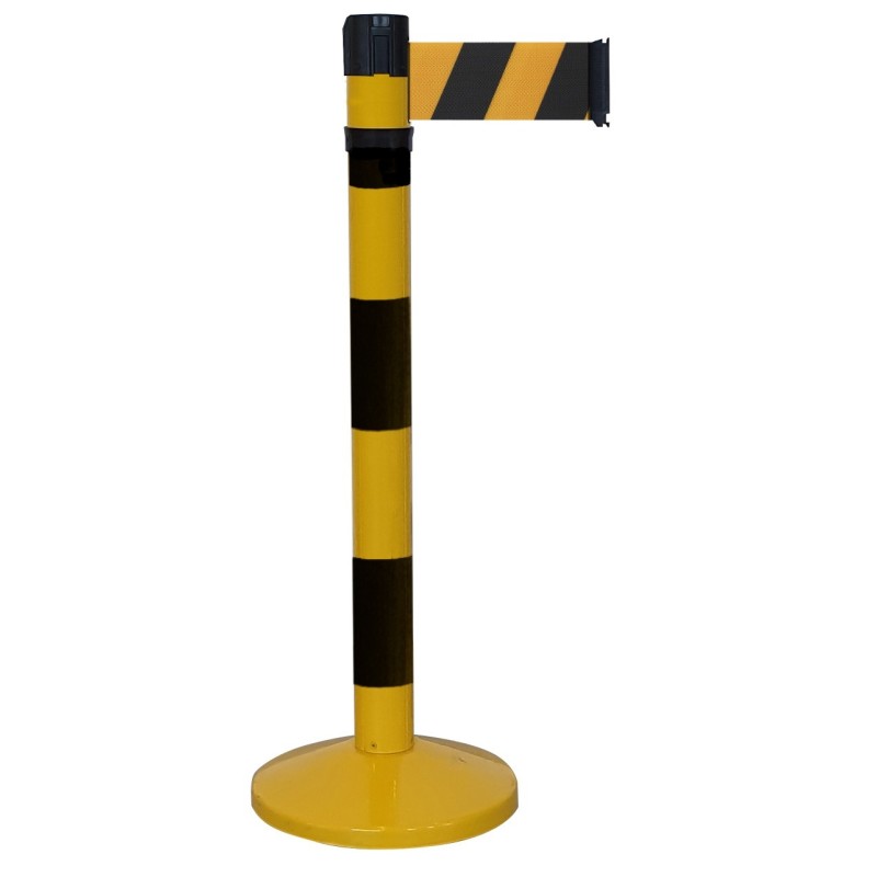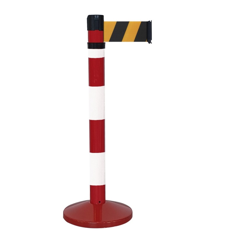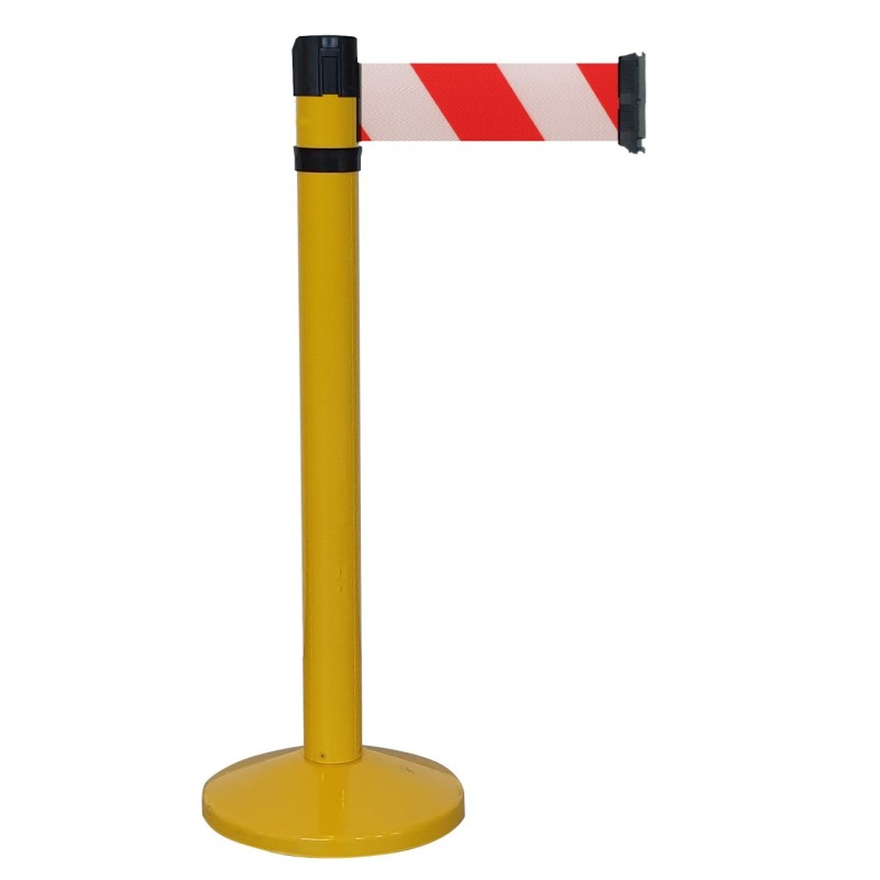 Poteau à sangle permettant de guider le public et de réguler le trafic. Le poteau possède une base à fixer et une sangle de 4 m de longueur sur 10 cm de largeur. La sangle quant à elle, possède un système de freinage et anti panique qui permet de décrocher automatiquement la sangle en cas d'urgence.