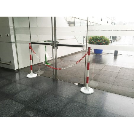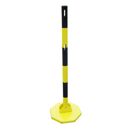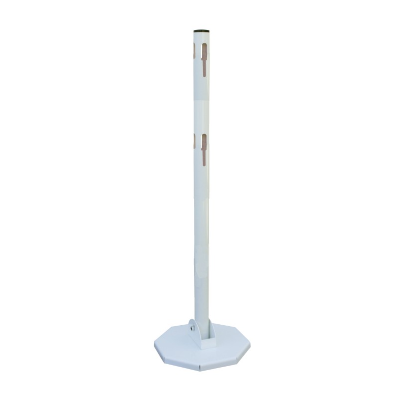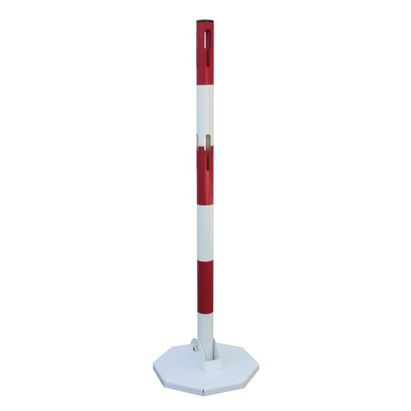 Poteau de balisage permettant de délimiter un accès facilement de manière temporaire ou permanente. Sa fonction pliable permet un gain de place lors du stockage. Fabriqué en acier. Possède une base lestée, deux niveaux pour accrocher des chaînes dans 4 directions possibles et une tête filetée pour accrocher des panneaux d'information. Livré avec 2 crochets pour chaines. Disponible en plusieurs couleurs. Les chaînes et barrières sont livrées séparément.