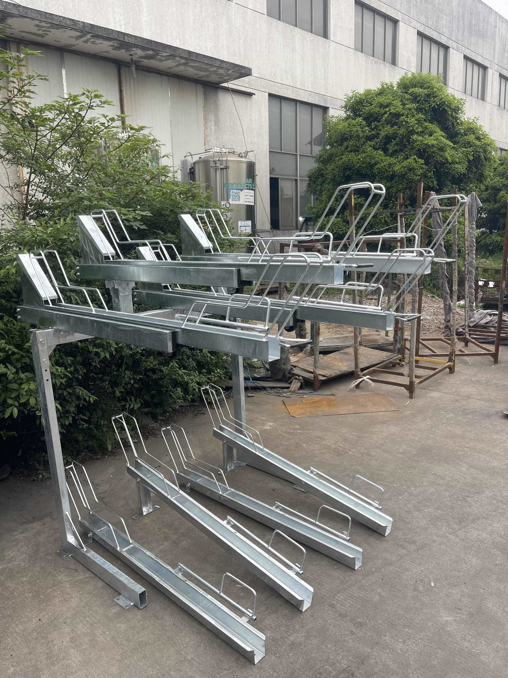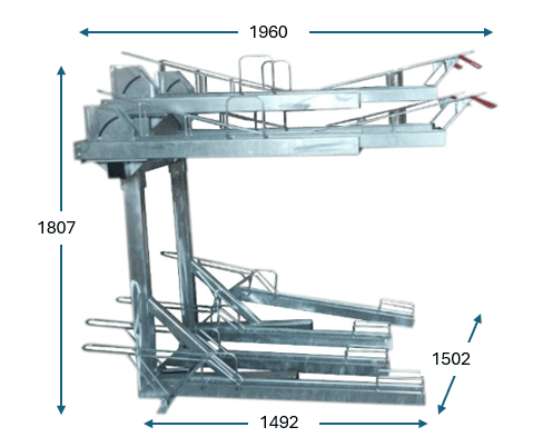 Range vélo à étages avec 2 hauteurs sur le niveau haut et le niveau bas pour faciliter le rangement des vélos. Jusqu'à 8 vélos avec système de basculement en hauteur par vérins à gaz et poignées avec renfort plastique.