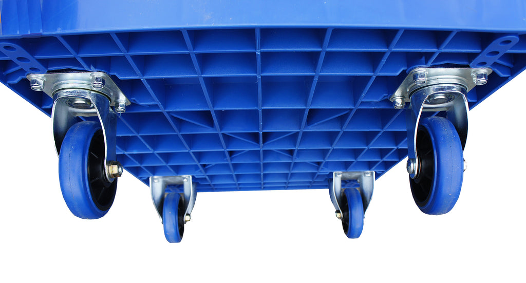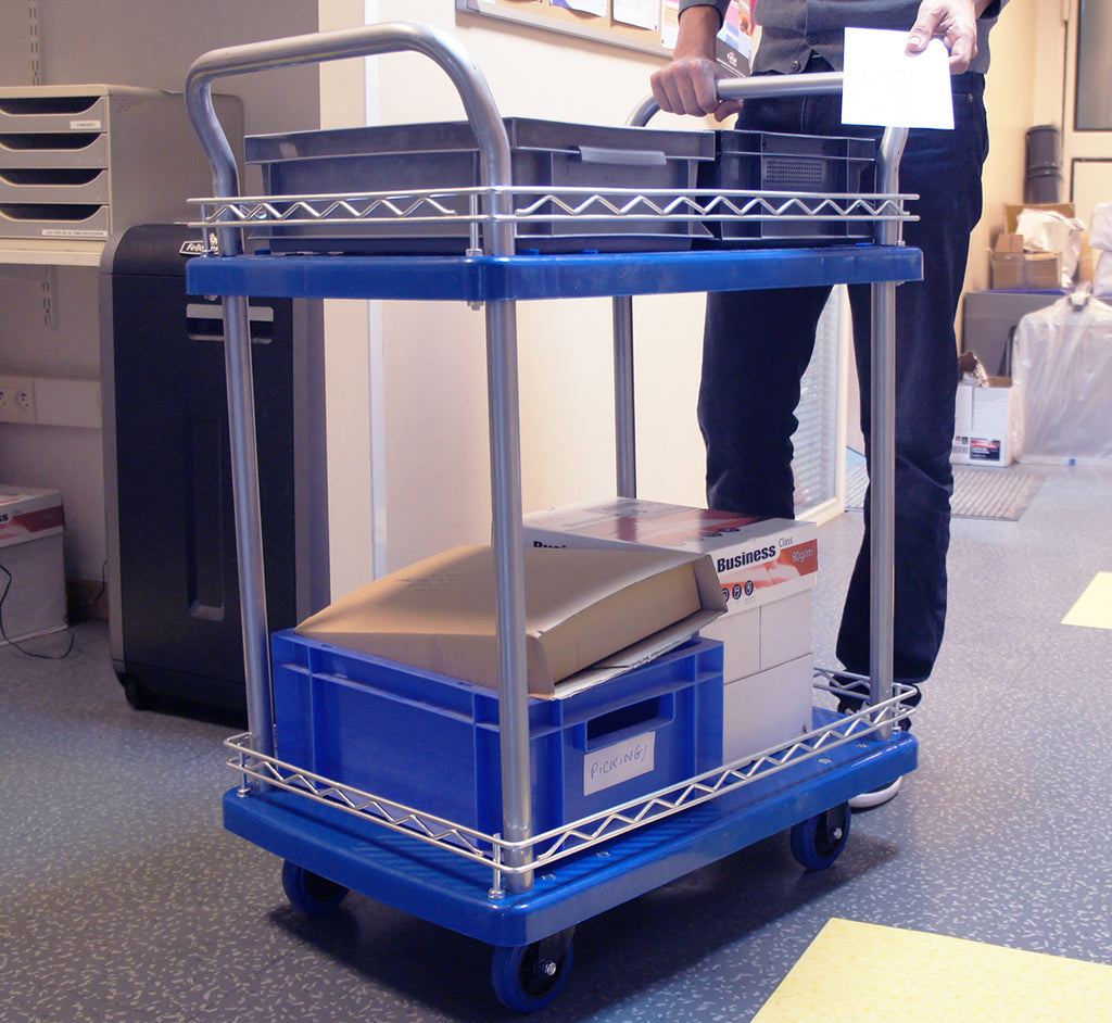 Servante double plateaux en polypropylène. Armature en acier zingué. Roues de 100mm dont 2 fixes et 2 pivotantes. Capacité de charge par plateau est de 75Kg, équipé de 4 patins anti-dérapants. Bords latéraux antichute.